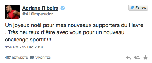 “Um Feliz Natal para os meus novos fãs de Le Havre. Muito feliz por estar com você para um novo desafio esportivo!!”, afirmou o jogador, por meio de sua página no Twitter, na qual fez questão de escrever em francês para comemorar o próximo passo de sua carreira.