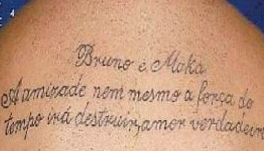Minas Gerais, MG, 10 (AFI) – Pelo visto, Bruno e Macarrão tem uma amizade das mais fortes. Os dois, acusados de envolvimento na morte da estudante Eliza Samudio, estão presos em Minas Gerais, e tiveram que tirar a camisa para fazer uma foto de registro no sistema penitenciário do Estado. Os dois mostravam tatuagens nas costas. Enquanto que Bruno mostrava um grande dragão, Macarrão tinha o nome de seu colega tatuado, em dizeres que remetiam a “amor”.