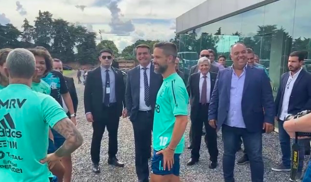 Ao lado de comitiva, Bolsonaro tieta jogadores em treino do Fla; Torcida protesta