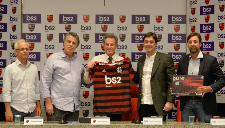 O vice-presidente de marketing e comunicação do clube, Gustavo Oliveira, o CEO rubro-negro Reinaldo Belotti, o presidente do BS2, Gabriel Guimarães, e o vice-presidente comercial do banco, Rodrigo Guimarães, também estiveram presentes na coletiva de apresentação do novo patrocinador master.