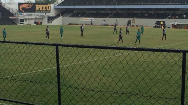 Central e Coruripe fizeram um primeiro tempo equilibrado, mas os primeiros minutos foram de estudos, com uma pequena vantagem para a equipe visitante. A primeira boa chance saiu dos pés de Denílson, que penetrou por meio da defesa adversária e arriscou de longe. Juninho fez a defesa com os pés. O goleiro voltou a brilhar logo depois. Em outra tentativa do atacante do clube alagoano, a bola tinha endereço certo, mas o arqueiro foi buscar.