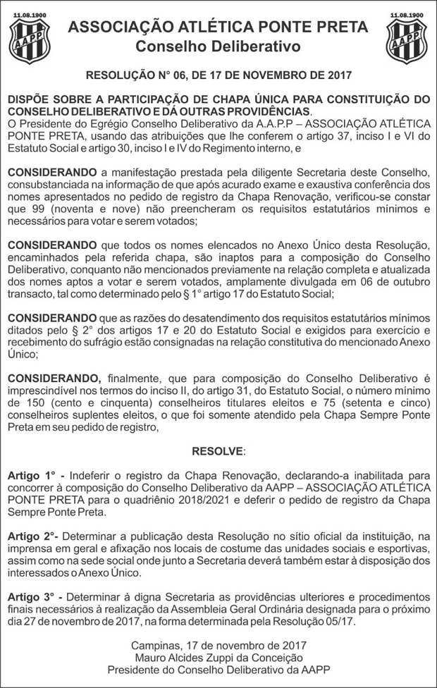 Campinas, SP, 17 (AFI) – Em edital publicado nesta sexta-feira no Jornal Correio Popular, de Campinas, o Conselho Deliberativo da Ponte Preta confirmou que o registro da Chapa Renovação foi indeferindo. De acordo com a publicação, 99 nomes estavam inaptos para a eleição. A decisão, porém, cabe recurso uma vez que não se trata de impugnação.