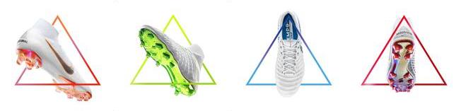 Além do branco, as chuteiras também se destacam pela cor do solado e do acabamento das travas, trazendo uma tonalidade diferente para cada uma das quatro grandes franquias de chuteira da Nike Futebol: Mercurial (Laranja), Magista (Carmesim), Hypervenom (Verde) e Tiempo (Azul).