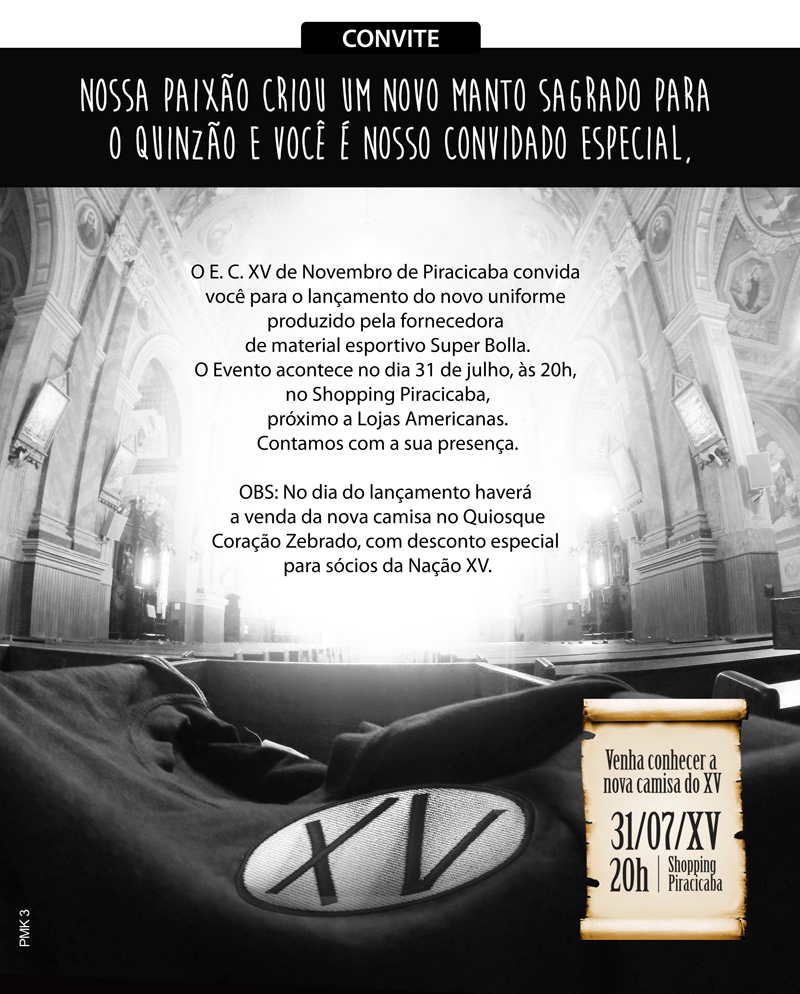 Serão divulgados os novos primeiro e segundo uniformes do Nhô Quim, assim como a camisa de viagem, o agasalho e os modelos feminino e infantil. A comercialização das primeiras unidades da camisa zebrada e do segundo uniforme acontece no quiosque Coração Zebrado, localizado no corredor da Garbo, também no Shopping Piracicaba. Na compra, sócios do clube terão desconto da seguinte forma: 30 % para Sócio Plus, 20% para Sócio XV e 15% para Sócio Torcedor.