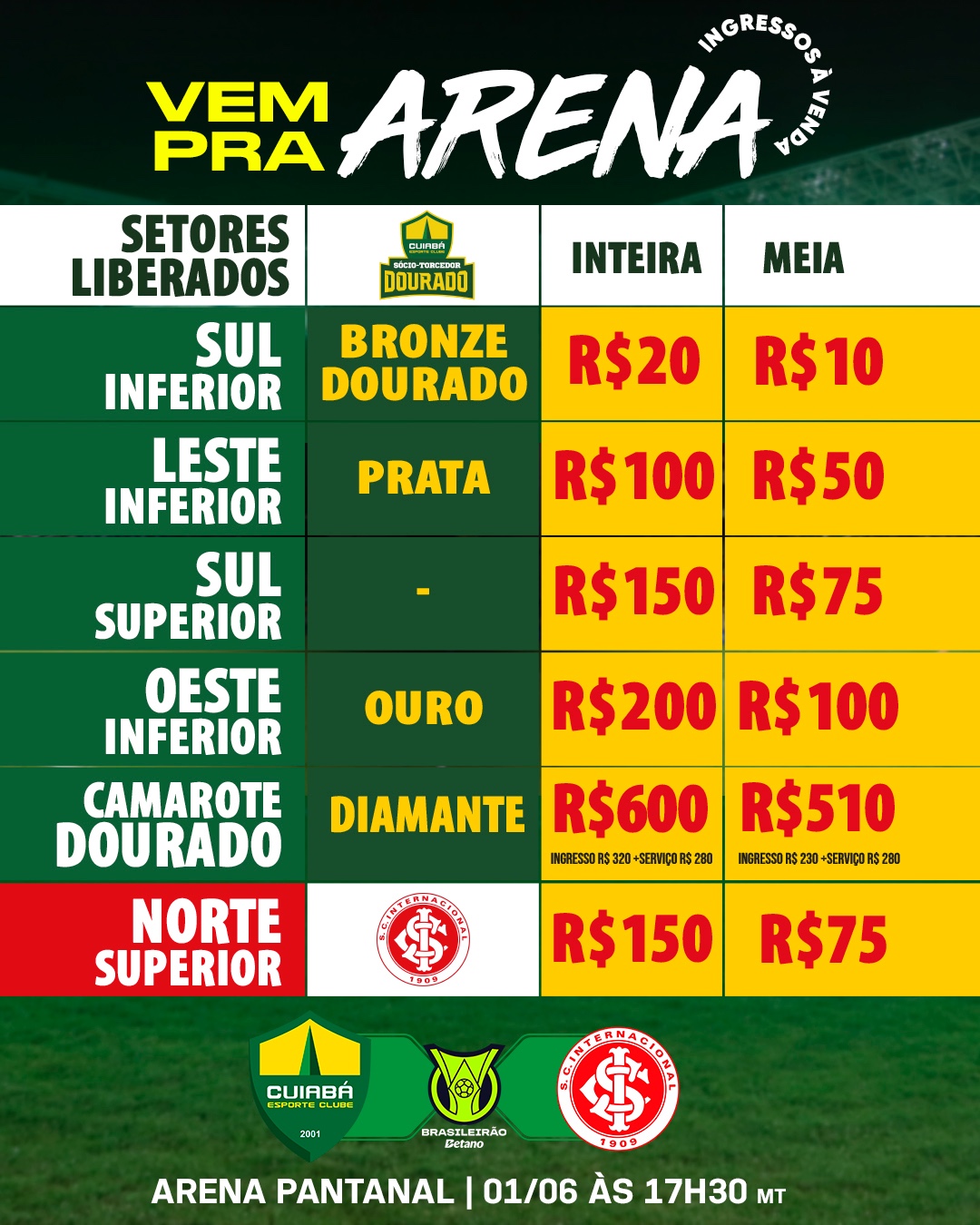 As entradas custam a partir de R$ 10 nos setores Sul, Leste e Oeste para a torcida do Dourado. A torcida visitante deve adquirir no setor Norte Superior com entradas a partir de R$ 75. Lembrando que o acesso à Arena Pantanal é feito somente com reconhecimento facial pelo Facepass.