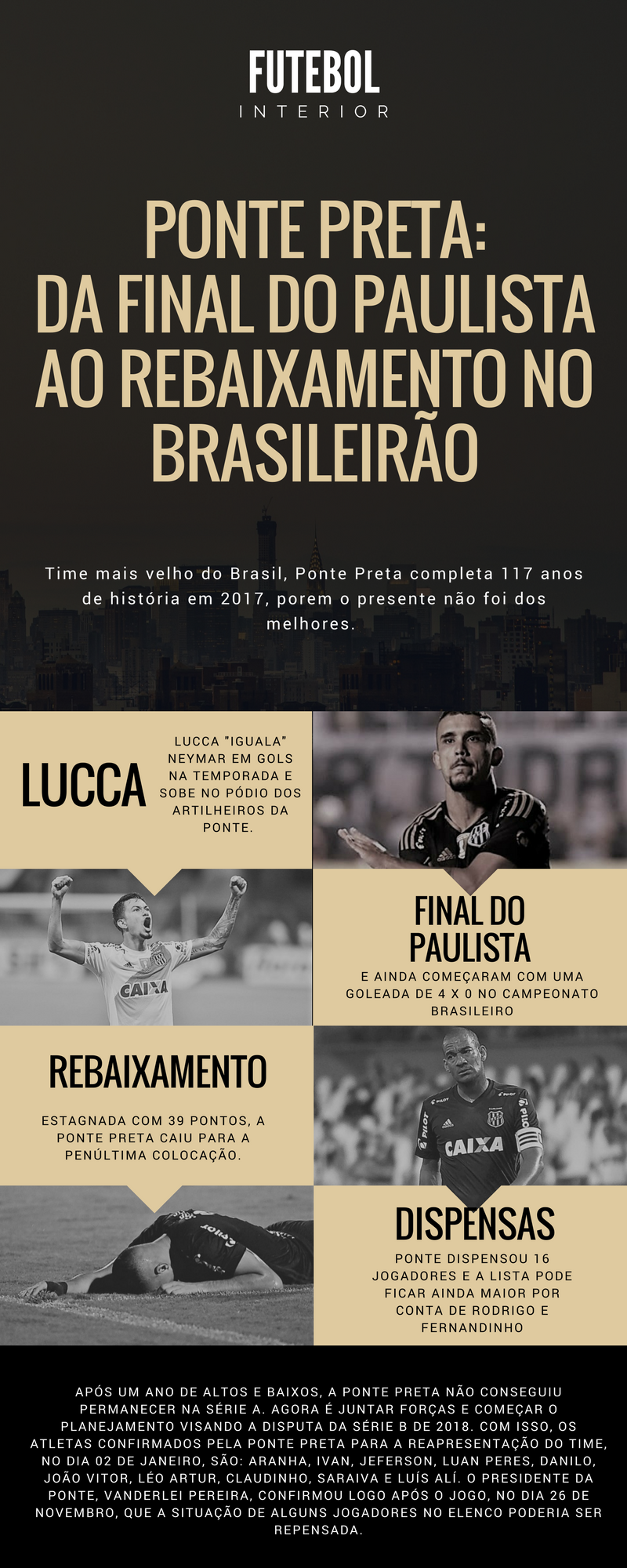 Campinas, SP, 06 (AFI) – A Ponte Preta viveu um temporada atípica. De finalista no Paulistão, ao perder o título para o Corinthians, a Macaca foi a rebaixada no Brasileirão. O PORTAL FUTEBOL INTERIOR traz um infográfico, em parceria com os Planos NET Internet, para resumir o que de fato aconteceu ao longo de 2017.
