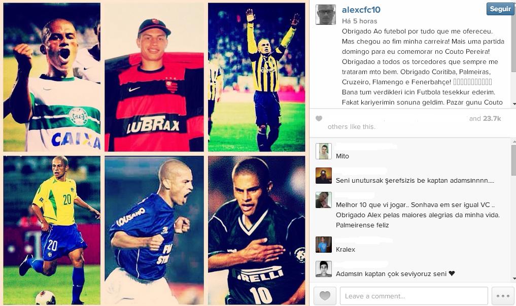Aos 37 anos, Alex já havia dado a entender mais de uma vez que iria abandonar os gramados ao fim deste ano para se dedicar aos estudos para ser treinador. O jogador, que chegou a ser especulado para ser companheiro de Kaká no Orlando City, clube novo da Major League Soccer (MLS), também deverá ser mais ativo no movimento Bom Senso FC após pendurar as chuteiras.
