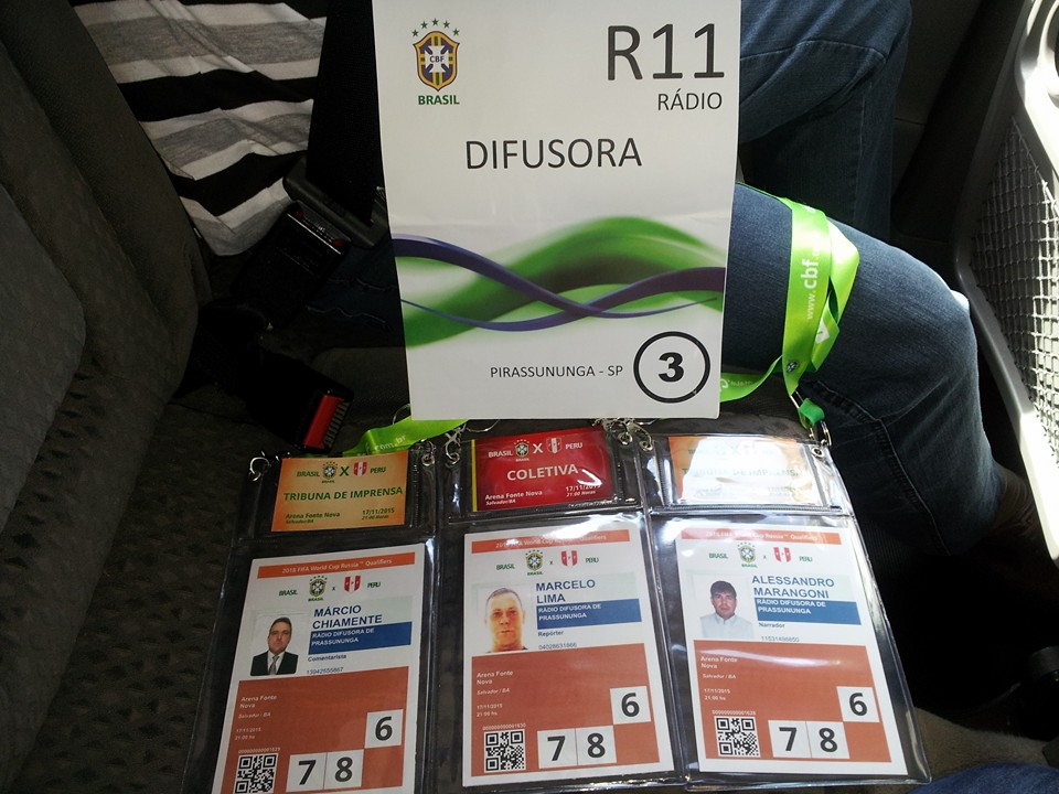 Equipe Show de Bola da Rádio Difusora de Pirassununga devidamente credenciada para o jogo da Seleção Brasileira diante do Peru em Salvador