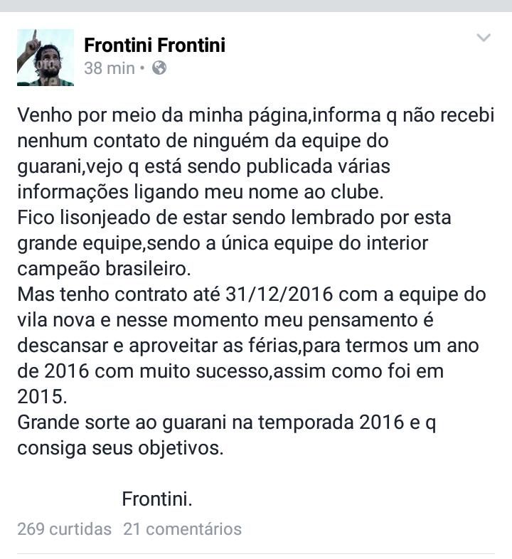 “Venho por meio da minha página informar que não recebi nenhum contato de ninguém da equipe do Guarani. Vejo que estão sendo publicadas várias informações ligando meu nome ao clube. Fico lisonjeado de estar sendo lembrado por esta grande equipe, sendo a única equipe do interior campeã brasileira. Mas tenho contrato até 31/12/2016 com a equipe do Vila Nova e nesse momento meu pensamento é descansar e aproveitar as férias, para termos um ano de 2016 com muito sucesso, assim como foi em 2015. Grande sorte ao Guarani na temporada 2016 e que consiga seus objetivos” publicou o atacante.