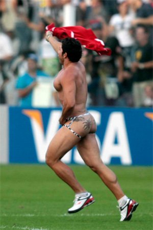 Ao lado de quatro policiais, o invasor deixou o campo vestido apenas com uma tanguinha recortada, de cores preta e branco. Chamou ainda a atenção pelos seios enormes, dando a impressão de que usava silicone. E também várias tatuagens pelo corpo, com destaque para os desenhos no bumbum.