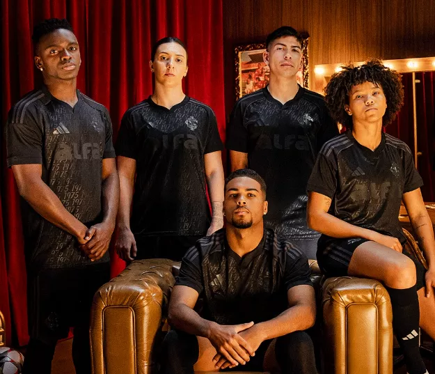 Meião e calção seguem o mesmo padrão monocromático. O símbolo do clube, o logo da Adidas e as icônicas três listras aparecem no mesmo tom escuro dos grafismos, reforçando a proposta visual do uniforme.