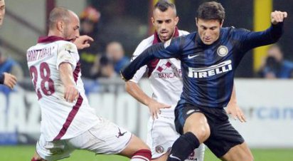 A Inter de Milão se manteve em quarto lugar no Campeonato Italiano ao vencer neste sábado o Livorno por 2 a 0, em casa, numa partida em que o argentino Javier Zanetti retornou ao time após oito meses de inatividade por uma lesão.