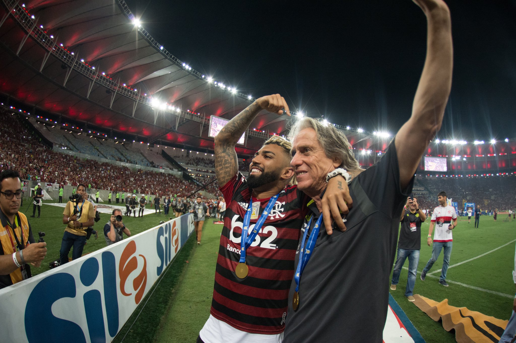 Na entrevista coletiva, o técnico Jorge Jesus mostrou toda a sua felicidade e destacou ainda mais as façanhas obtidas pelo time com os títulos da Copa Libertadores e do torneio nacional.