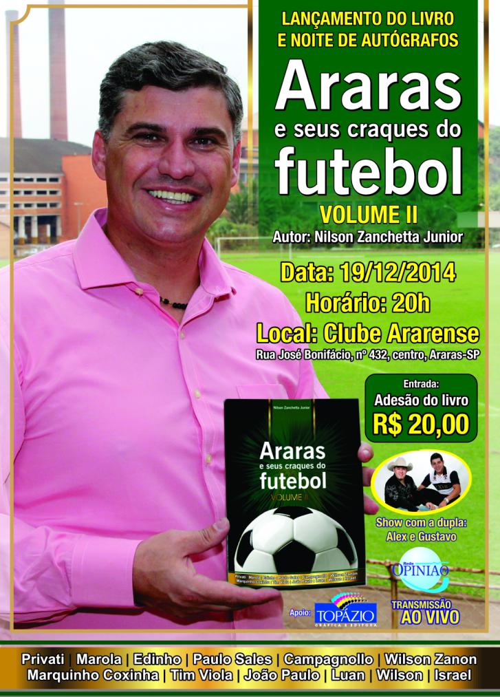 Araras, SP, 14, (AFI) – O jornalista Nilson Zanchetta Junior, atualmente na Rádio Central e Portal Futebol Interior de Campinas, lançará no dia 19 de dezembro, no Clube Ararense em Araras-SP, o volume II do livro Araras e seus craques do futebol.
