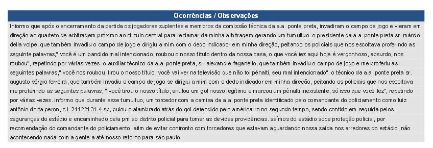 Campinas, SP, 19 (AFI) – O árbitro goiano Eduardo Tomaz de Aquino Valadão não poupou “tinta” na súmula do polêmico empate entre Ponte Preta e América-RN, por 2 a 2, nesta terça-feira. Após ser duramente criticado por sua atuação, o juiz carregou na súmula contra o presidente Márcio Della Volpe e contra a comissão técnica, além de relatar a invasão de um torcedor no Estádio Moisés Lucarelli.