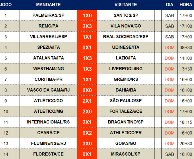 Teve, por exemplo, a final do brasileiro da Série C, que apontou o Vila Nova campeão após vencer o Remo, por 3 a 1, no Mangueirão em Belém (PA) (coluna 2 no Jogo 2). O primeiro jogo final da Série D também esteve no concurso, com a derrota em casa do Floresta-CE para o Mirassol-SP por 1 a 0. (coluna 2 no Jogo 14)