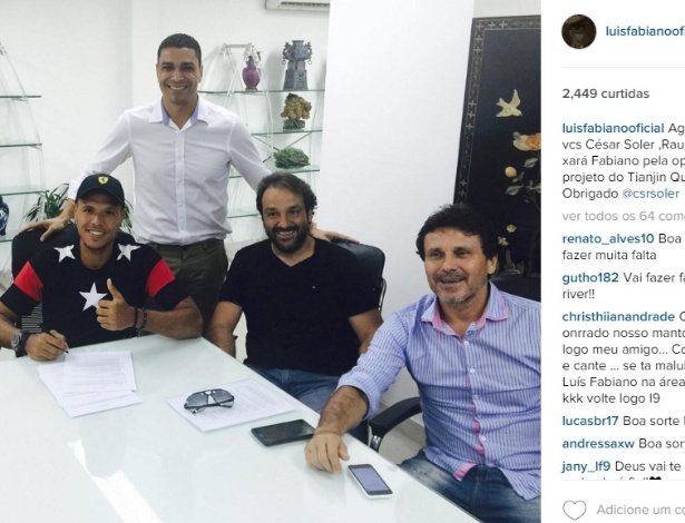 O atacante Luis Fabiano publicou em sua conta do Instagram uma foto em que assina o contrato ao lado dos diretores do Tianjin Quanjian