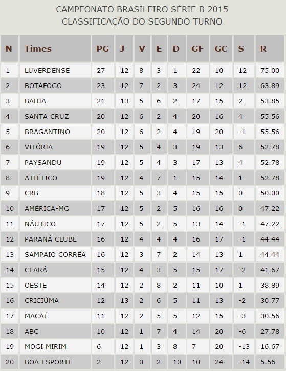 O líder do campeonato seria o Luverdense, que em 12 jogos venceu oito, empatou três e perdeu apenas uma partida. Soma 27 pontos e é disparado o melhor do segundo turno. Logo atrás aparece o Botafogo, com 23 pontos, seguido do Bahia, com 21, e do Santa Cruz, com 20 – leva vantagem no critério de desempate com o Bragantino, quinto colocado, também com 20.