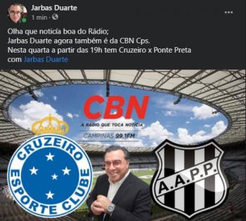 Campinas, SP, 30 (AFI) – Em tempos de dificuldades onde várias empresas estão fechando suas portas devida a pandemia do novo Corona Vírus, a Rádio CBN, de Campinas, FM 99,1Mhz, com a equipe de esportes comandada pelo comentarista João Carlos de Freitas, deu uma tacada de mestre e abriu as portas para mais um profissional gabaritado do rádio brasileiro. Após 33 anos afastado da cidade como profissional, Jarbas Duarte retorna para narrar na emissora.