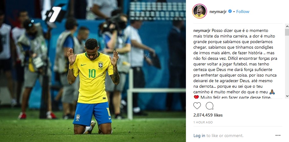 São Paulo, SP, 07 – Um dia depois da derrota para a Bélgica, em Kazan, e da eliminação nas quartas de final da Copa do Mundo da Rússia, Neymar quebrou o silêncio. Neste sábado, o astro da seleção brasileira fez postagem no Instagram e lamentou o que disse ser “o momento mais triste da carreira”.