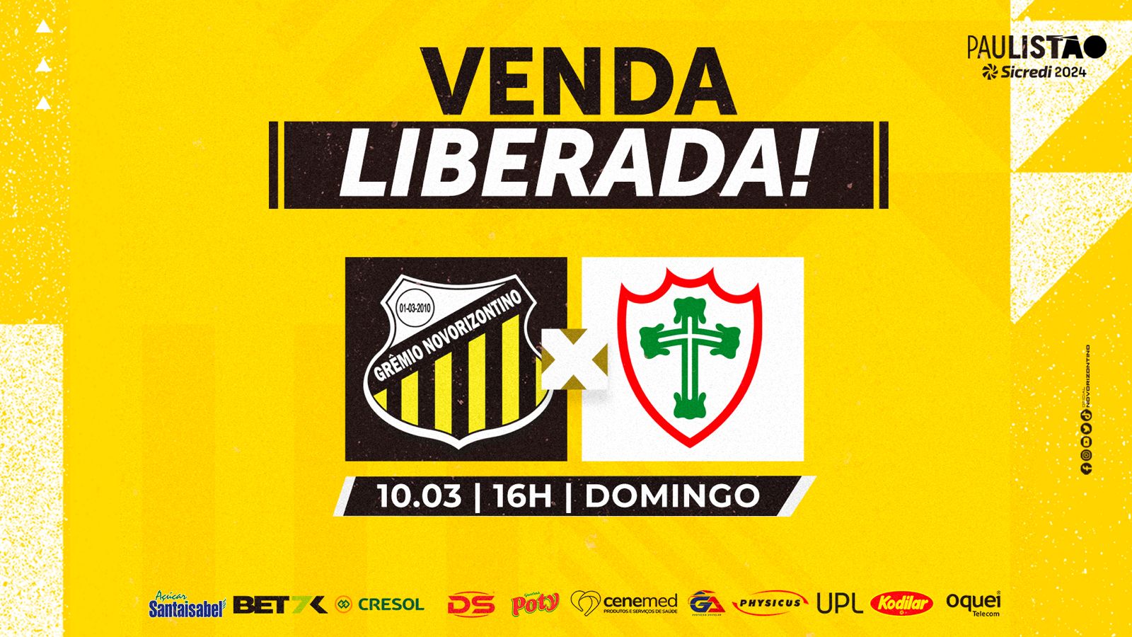 Novo Horizonte, SP , 05 (AFI) – Chegou a hora do torcedor do Grêmio Novorizontino mostrar sua força e apoiar o Tigre do Vale na busca pela classificação às quartas de final do Paulistão Sicredi 2024. Depois do empate em 1 a 1 com a Ponte Preta, o Aurinegro só depende de suas forças para avançar à fase eliminatória do Estadual. No domingo (10), às 16 horas, o Tigre recebe a Portuguesa, no Estádio Jorge Ismael de Biasi, em Novo Horizonte, decidindo a vaga e também a liderança do Grupo D. O Novorizontino tem os mesmos 19 pontos do São Paulo, que lidera pelo saldo de gols – 7 contra 4. Os ingressos para o jogo já estão liberados para compra no site da Total Ticket e na Loja Sport Billy, no Centro da cidade.