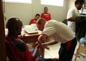 “Outro procedimento adotado há algum tempo está no acompanhamento técnico conhecido como CK (creatina quinase), que através de uma coleta de sangue é possível avaliar com precisão o desgaste físico muscular sofrido pelos jogadores após os treinos e as partidas. Através destes resultados ocorre a decisão a ser tomada. A prevenção inclui ainda a imersão em gelo e administração de antioxidantes”, informou.