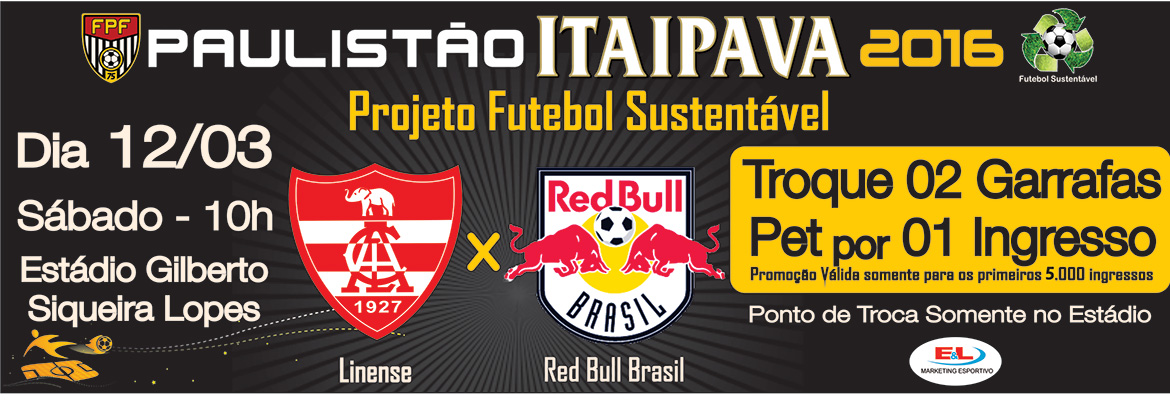 Lins, SP, 07 (AFI) – Para o confronto com o Red Bull Brasil no próximo sábado, às 10 horas, o Linense terá mais uma vez o Programa Futebol Sustentável, da empresa E&L Marketing Esportivo em parceria com a Federação Paulista de Futebol (FPF), que troca duas garrafas pet por ingresso. O confronto desta 9ª rodada do Paulistão serão no estádio Gilberto Siqueira Lopes, em Lins.