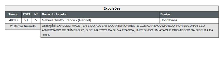 “Expulso após ter sido advertido anteriormente com cartão amarelo, por segurar seu adversário de número 27, Marcos da Silva França (Keno), impedindo um ataque promissor na disputa da bola”, escreveu o árbitro na súmula. Entretanto, foi Maycon quem segurou o palmeirense, enquanto Gabriel nem estava no lance.