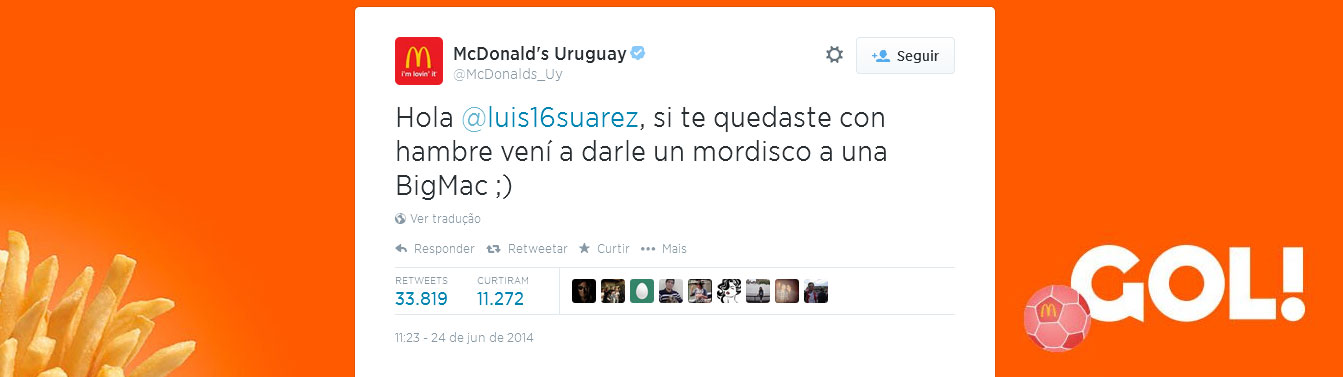 Campinas, SP, 24 (AFI) – O responsável pela conta oficial do McDonald’s do Uruguai no twitter resolveu participar da Copa do Mundo de forma inusitada. Tão logo o atacante Luis Suárez mordeu o italiano Chiellini, a rede de fast food deu uma cutucado de forma irreverente no uruguaio.