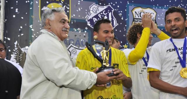 Careca recebe o prêmio de artilheiro do Campeonato Sul-Mato-Grossense das mãos do presidente Francisco Cesário de Oliveira, o Cesário.