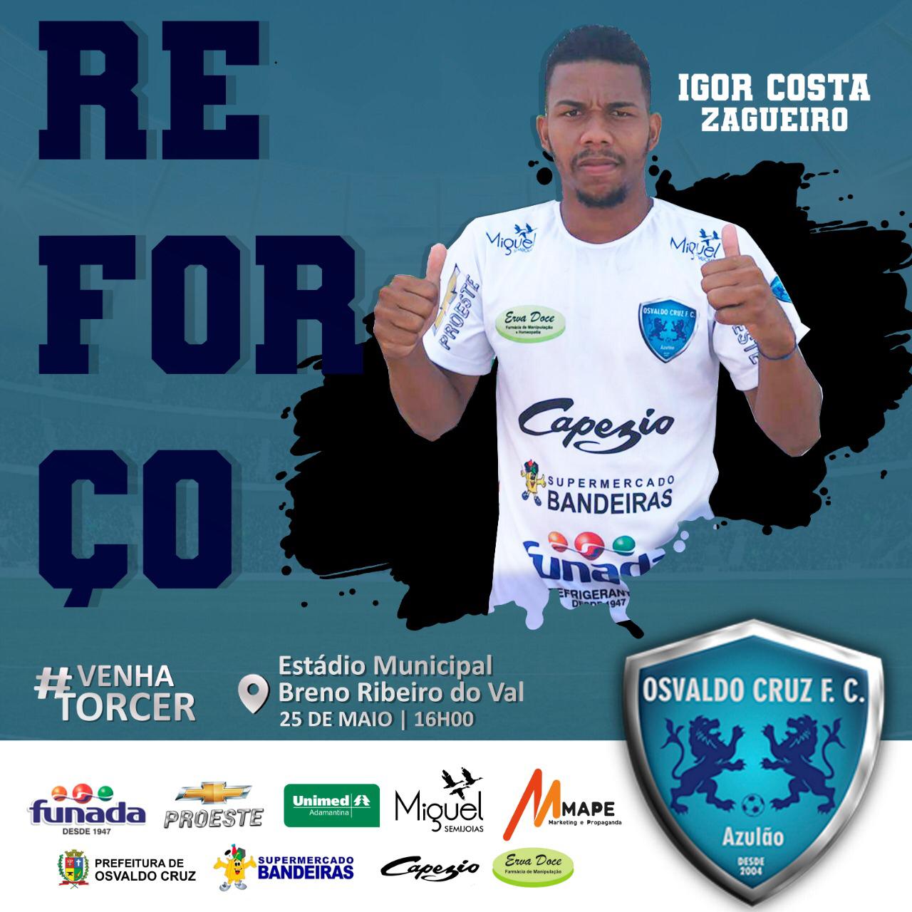 Osvaldo Cruz, SP, 24 (AFI) – Com apenas uma vitória em seis jogos, o Osvaldo Cruz vive um momento complicado na busca pela classificação para a segunda fase do Campeonato Paulista da Segunda Divisão e por isso segue no mercado reforçando o seu elenco. Tanto que na noite desta quinta-feira, o Azulão confirmou a chegada do zagueiro Igor Costa.