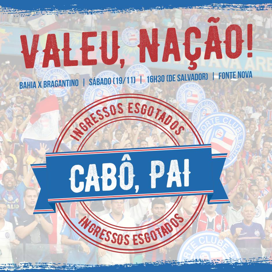 Salvador, BA, 11 (AFI) – Acabou. Se depender da torcida o Bahia já está com a vaga na primeira divisão nacional. Isso porque os torcedores esgotaram os 43.535 ingressos que foram colocados a venda para a partida com o Bragantino no outro sábado, dia 19, pela 37ª rodada do Campeonato Brasileiro da Série B. Este será o último jogo no ano em Salvador e pode decretar a vaga na Série A 2017. A bola rola a partir das 17h30.