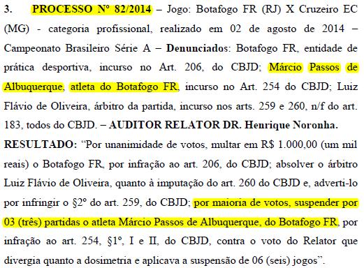 O Márcio Passos famoso acabou punido, no final da tarde desta sexta-feira, pelo STJD. Ele acabou recebendo a suspensão por conta de uma entrada violenta no volante Henrique, do Cruzeiro, no último dia 2, pelo Brasileirão. Ele não foi expulso na partida, mas acabou denunciado posteriormente.