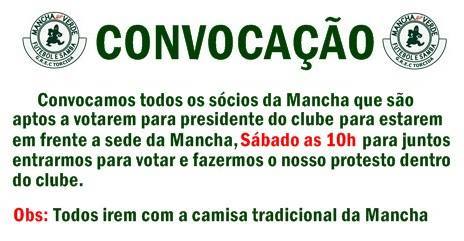 Convocamos todos os sócios da Mancha que estão aptos a votar para presidente do clube para estar em frente à sede da Mancha, sábado, às 10h, para juntos entrarmos para votar e fazermos nosso protesto dentro do clube”, diz o comunicado, que reforça para que seus associados usem a camisa tradicional da torcida. Além da Mancha, a TUP (Torcida Uniformizada do Palmeiras) já havia pintado na fachada de sua sede palavras de protesto contra Nobre.