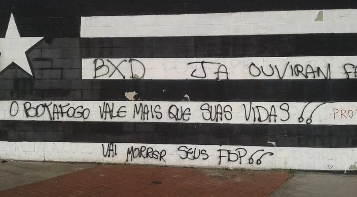 “Já ouviram falar em morte de jogador?”, “O Botafogo vale mais que suas vidas”, “Protejam as crianças”, “Vai morrer, seus fdp” e “Mercenários” foram algumas das frases escritas nos locais.