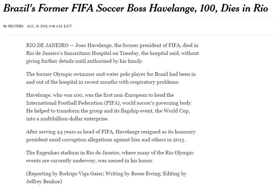 A morte de João Havelange não passou em branco no noticiário mundial