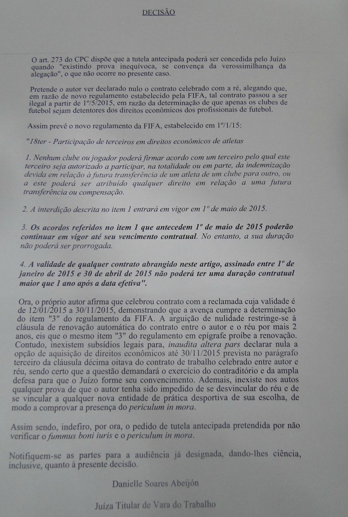 Bichara Neto, advogado de Arão, solicitou a tutela antecipada, mas a juíza Danielle Soares, titular da Vara do Trabalho, não aceitou o pedido, o que mantém o atleta vinculado ao Botafogo. O Glorioso aproveitou seu site oficial para publicar a decisão.